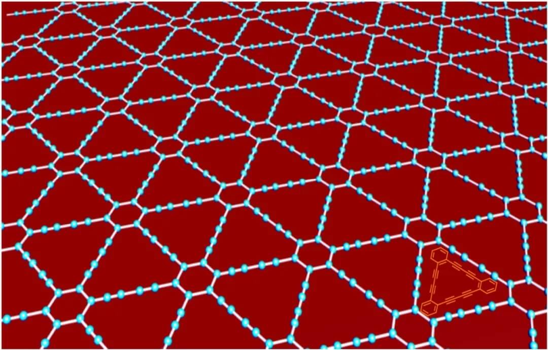 2010年,李玉良团队提出了在铜箔表面上通过化学方法原位合成石墨炔并首次成功地获得了大面积(3.61cm2)的石墨炔薄膜,且第一次被李玉良等研究人员用汉语命名为“石墨炔”。从结构上,石墨炔可以被看作是石墨烯中三分之一的C―C中插入两个C≡C(二炔或乙炔)键,这使得这种石墨炔中不仅具备苯环,而且还有由苯环、C≡C键构成的具有18个碳原子的大三角形环。额外的炔键单元使这种石墨炔的孔径增加到大约0.25nm。