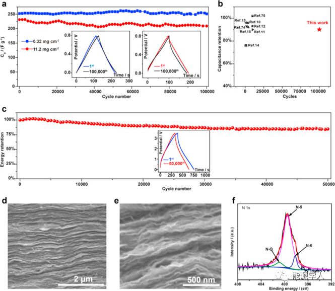 图5. (a)NGF0.32-SC和NGF11.2-SC在水系电解液中的循环稳定性,插图显示NGF0.32-SC(左)和NGF11.2-SC(右)的首圈和第10万圈GCD曲线对比。(b)NGF11.2和报道的水系高负载超级电容器电极的稳定性比较。(c)NGF11.2-SC在离子液体中的循环稳定性,插图显示NGF11.2-SC的首圈和第10万圈GCD曲线对比。(d,e)NGF11.2长循环后横截面SEM图。(f)长循环后,NGF11.2的N 1s区域的XPS分峰图。