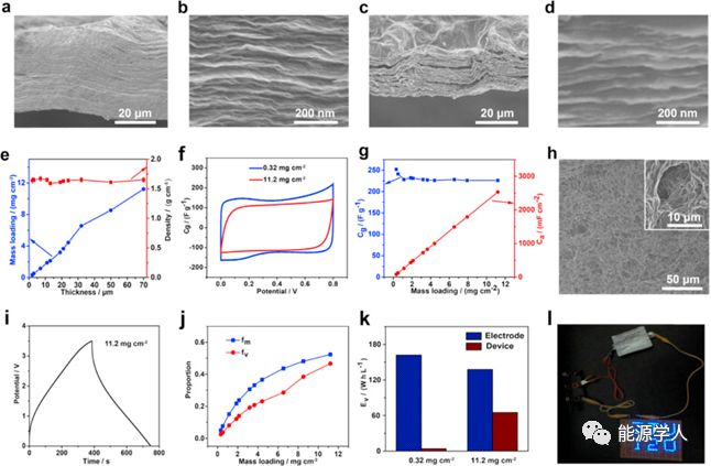 图4.(a,b)~70 μm厚度的NGF的横截面SEM图像。(c,d)~20 μm厚度的GF的横截面SEM图像。(e)NGF的负载量几乎与厚度成正比,并且NGF的密度几乎保持不变。(f)NGF0.32-SC和NGF11.2-SC在1 M H2SO4中的CV曲线,扫描速率为10mV/s。(g)在1A/g的电流密度下负载量对NGF-SC的Cg和Ca的影响。(h)NGF表面的SEM图像,插图是显示裂缝的放大图像。(i)NGF11.2-SC在离子液体中1A/g下的GCD曲线。(j)负载量对活性物质质量占比和体积占比的影响。(k)高低负载量对电极和器件的性能影响。(l)64个蓝色LED由一个NGF11.2组装的软包电池供电。