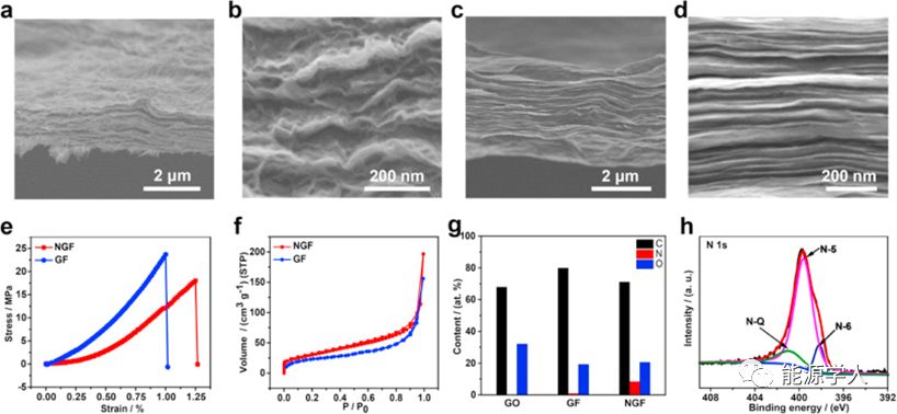 图2.(a,b)具有不同放大倍数的NGF的横截面SEM图像。(c,d)具有不同放大率的GF的横截面SEM图像。(e)NGF和GF力学测量。(f)NGF和GF氮吸附曲线。(g)基于XPS数据的GO,GF和NGF中的C,N和O元素含量。(h)NGF的N 1s的XPS分峰。