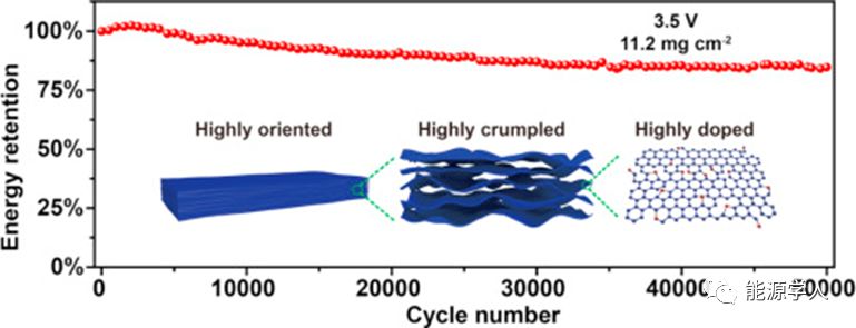 近日,浙江大学高超教授(通讯作者)课题组在国际顶级期刊Energy Storage Materials 上发表题为“Tri-high designed graphene electrodes for long cycle-lifesupercapacitors with high mass loading”的论文。第一作者为黄铁骑博士。研究人员提出了由“高取向,高褶皱和高掺杂”(三高)设计引导的石墨烯电极的制造策略。其中,“高取向”保证了较高的电导率以及电极堆积密度,“高褶皱”保证了较为快速的离子传输孔道,“高掺杂”保证了相较于传统双电层电容更高的赝电容的发挥。为了实现所提出的“三高”设计原则,该课题组利用湿法纺丝技术和水热反应两步法,制备了密度高达1.64g/cm3的自支撑氮掺杂石墨烯薄膜(NGF)。NGF具有独特的长程有序和短程无序结构,确保电极在高填充密度(高达1.64g/cm^3)下依旧保持高效的离子传输。在水系电解液中,基于NGF的对称超级电容器(NGF-SC)在面积质量负载为0.32mg/cm^2时比电容为413F/cm^3或252F/g,在11.2mg/cm^2时仍然具有370F/cm^3或226F/g。对于高质量负载(11.2mg/cm^2)的情况,电极在100,000次循环后仍然保留90.1%的初始比容量。在离子液体中,电极负载为11.2mg/cm^2的NGF-SC在0-3.5V的电位窗口下具有超高的电极能量密度138Wh/L;并且得益于“三高”设计和高质量负载,整个NGF-SC器件的能量密度达到65Wh/L,远高于商用超级电容器。这种NGF-SC还显示出长达50,000圈充放电循环的长寿命,能量保持率为84.8%。研究人员将这些优异的性能归功于“三高”设计引入的独特的“长程有序,短程无序”结构:长程有序确保连续导电网络,短程无序提供有效的离子通路。“三高”设计的提出为解决高性能和高负载之间的不匹配提供了有效简明的思路,是超级电容器电极材料重要的设计理念。