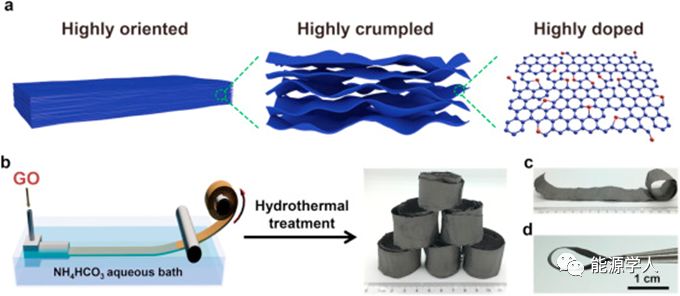 图1.(a)“高取向,高褶皱、高掺杂”(三高)设计的示意图。蓝球:碳原子,红球:氮原子。(b)NGF的大规模制备的示意图。(c)半展开的NGF卷的实物展示。(d)具有弯曲状态NGF的实物展示。