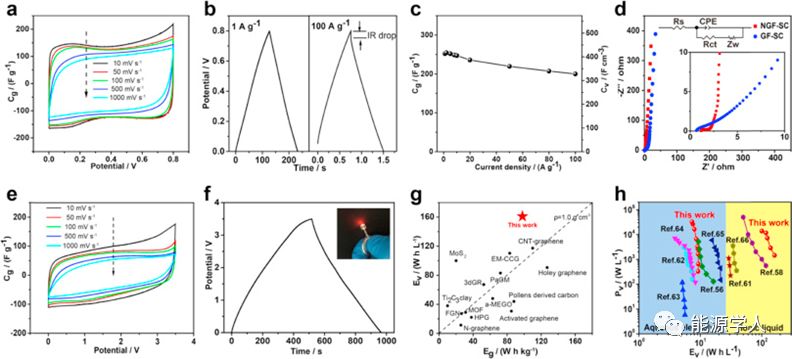 图3.(a)在10,50,100,500,1000mV/s的扫描速率下测量的NGF-SC的CV曲线。(b)在1和100A/g的电流密度下测量的NGF-SC的GCD曲线。(c)通过GCD曲线计算NGF-SC的倍率特性,电流密度从1至100A/g。(d)具有等效电路的NGF-SC和GF-SC的Nyquist图,插图显示放大的高频区域。(e)在10,50,100,500,1000mV/s的扫描速率下测量的NGF-SC在离子液体中的CV曲线。(f)NGF-SC在离子液体中电流密度为1A/g时的GCD曲线,插图显示NGF单个3.5V器件能点亮LED灯。(g)NGF-SC的Eg和Ev与文献报道的电极的数值比较。(h)水系电解液和离子液体中,NGF与报道的碳质电极的体积Ragone图比较。