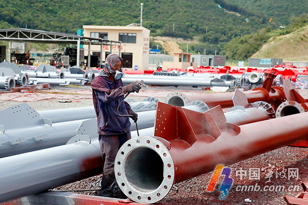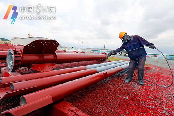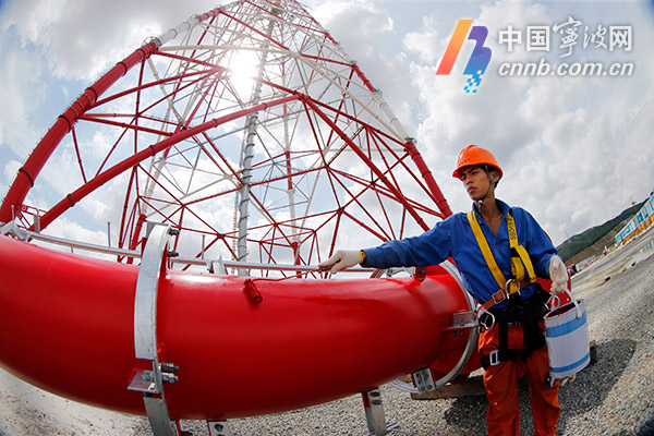 中国宁波网讯(记者徐展新 孙肖 通讯员唐瑾瑾) 今天上午,高达380米的舟山西堠门大跨越输电铁塔下,来自国网宁波供电公司的电力工人们忙碌地进行着喷涂工作。随着最后一根塔材完成喷涂、并吊装至高空完成安装,这座“世界第一输电高塔”正式披上了宁波制造的“防腐外衣”。