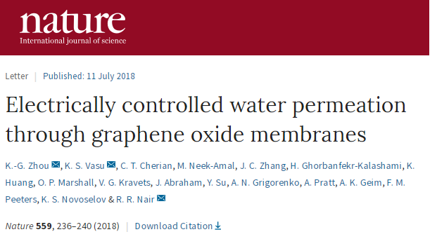Zhou, K.-G., Vasu, K. S., Cherian, C. T., Neek-Amal, M., Zhang, J. C., Ghorbanfekr-Kalashami, H., … Nair, R. R.. Electrically controlled water permeation through graphene oxide membranes. Nature, 2018.