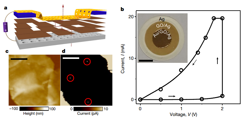 研究人员首先构造Au/GO/Ag三明治结构,该材料随后用于密封含水的容器并将其暴露于水蒸气中。利用通常在大电场、有水出现时,绝缘体表面会形成永久的导电路径的现象,通过可控电场击穿在氧化石墨烯膜内部形成导电丝。