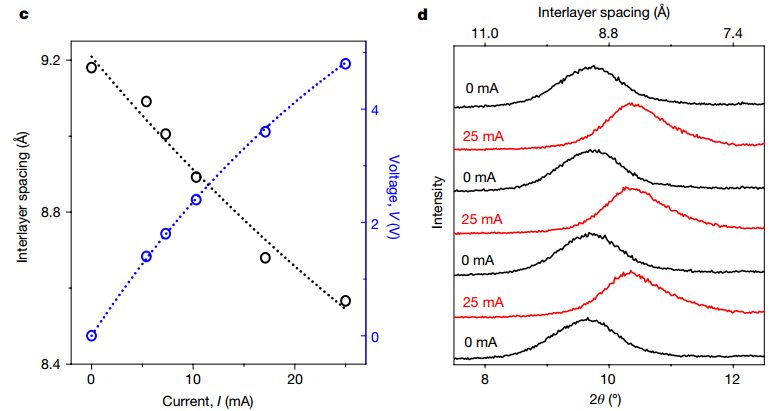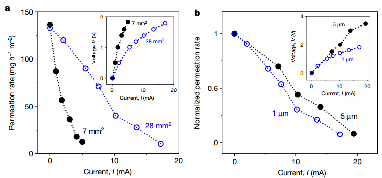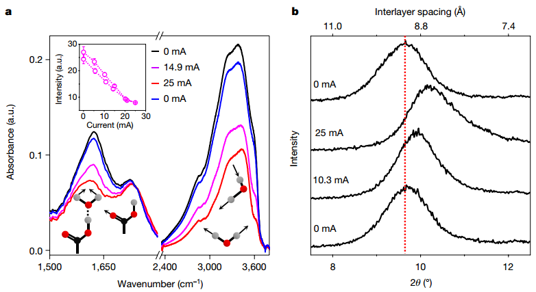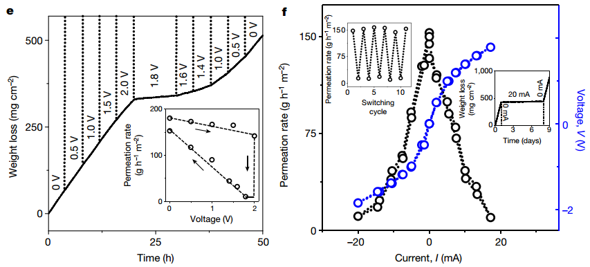 电流-电压(I-V)测试结果表明,电场击穿后设备出现永久性导电通道。同时,水分子渗透过膜具有小的电阻,与电压值密切相关。水分子运输主要由通过导电丝的电流控制,而非电压。原位红外(IR)与X射线衍射(XRD)测试、分子动力学模拟测试表明其机理可能与电流介导的水分子电离有关。