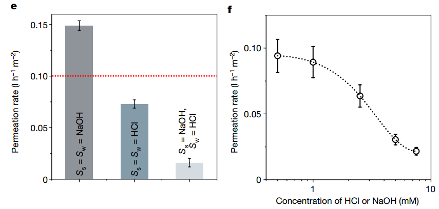 图4 | H3O+和OH–离子对纳米通道内水动力学的影响