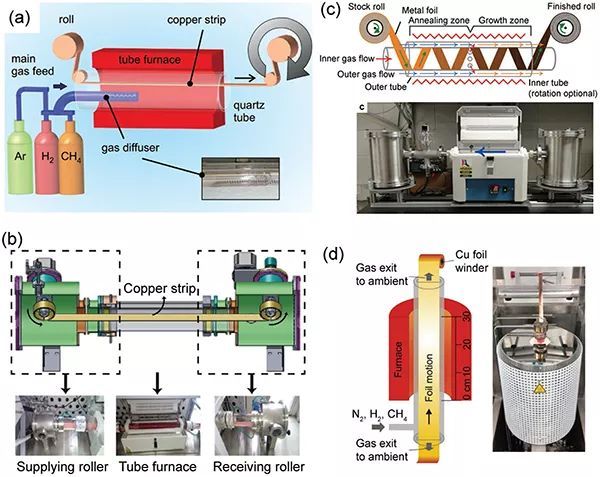 (a) 卷绕在石英管上的铜箔和大型管式炉的图片;