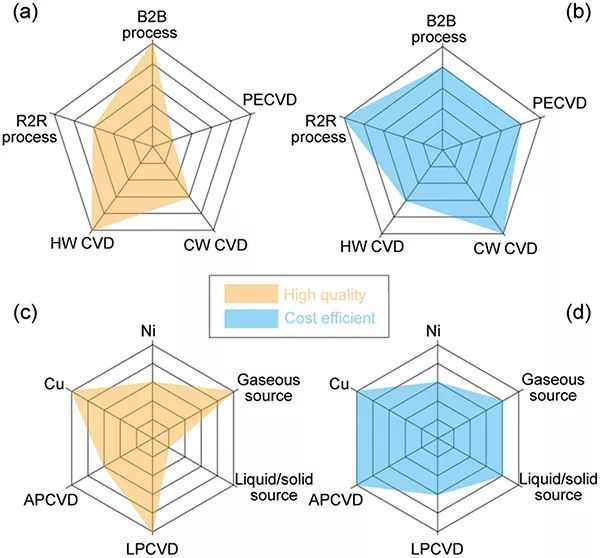 (c,d) 各种关键参数,包括基板(Cu,Ni)、压力(APCVD,LPCVD)和碳源(气态,液态和固态)制备的石墨烯性能和成本评估。