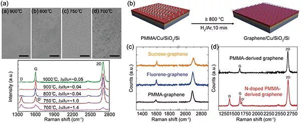 (c) 使用各种固体碳源生长的石墨烯的拉曼光谱;