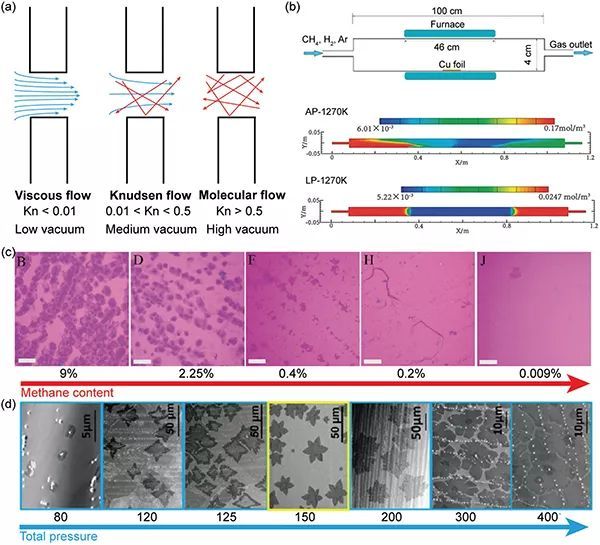 (c) 不同甲烷浓度下在SiO2上利用APCVD合成的石墨烯的光学显微图像;