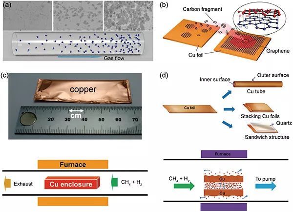 (d) 叠层Cu箔限域空间内石墨烯的生长以及抑制Cu挥发的示意图。
