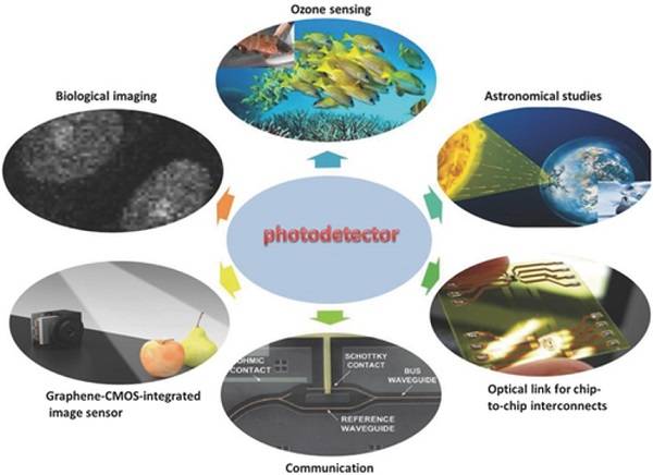 光电探测器在臭氧传感、天文研究、芯片间互联的光学链接、光通讯、石墨烯-CMOS集成图像传感器和生物成像等领域的应用