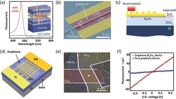 (a)微腔增强的石墨烯光电探测器示意图,红色曲线是石墨烯光电探测器耦合微腔后的光电流