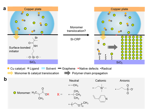 针对此,最近,德国德累斯顿工业大学的Rainer Jordan教授课题组张涛博士及中国科学院宁波材料技术与工程研究所陈涛研究员课题组等多家单位的研究人员通过实验及理论预测提出了一个新思路,即表面引发可控的可控自由基聚合可以来诱导乙烯基单体作为“倚天剑”穿透单层石墨烯这一“金钟罩”(Nat. Commun. 2018, 9, 4051: https://www.nature.com/articles/s41467-018-06599-y.pdf)。在他们的研究中,引发剂可以选择性地键合到固体基体表面用以驱动单体的运动和后续补充。在单层CVD石墨烯将引发剂和单体隔离的条件下,证明了各种尺寸的乙烯基单体在引发剂的驱动下可以穿过单层CVD石墨烯并成功实现表面引发聚合。他们的研究发现,这是由于只有原子层厚度的石墨烯无法阻挡自由基引发剂和单体之间(以及催化剂)的库仑作用力,从而实现了引发剂在石墨烯另一端对单体的驱动和迁移。同时,可控自由基聚合的特性使得单体可以稳定的速率连续地被输送到石墨烯的另一端,并在石墨烯覆盖的表面得到聚合物分子刷(如图1)。最终,通过研究石墨烯覆盖的聚合物分子刷厚度和形貌可以计算多类型的单体通过单层石墨烯的行为和速率。