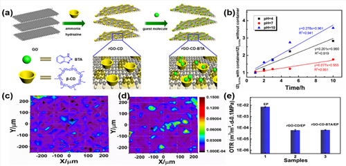 图1 (a)纳米容器制备及缓蚀剂负载示意图,(b)缓蚀剂在不同条件下的释放过程图,(c)纳米容器及(d)负载缓蚀剂的纳米容器在涂层中的分布图,(e)各涂层体系的氧气渗透率