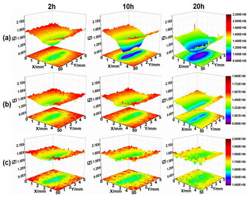 图2 (a)纯环氧涂层,(b)纳米容器环氧复合涂层,(c)负载缓蚀剂的纳米容器环氧复合涂层缺陷处局部电化学阻抗分布图