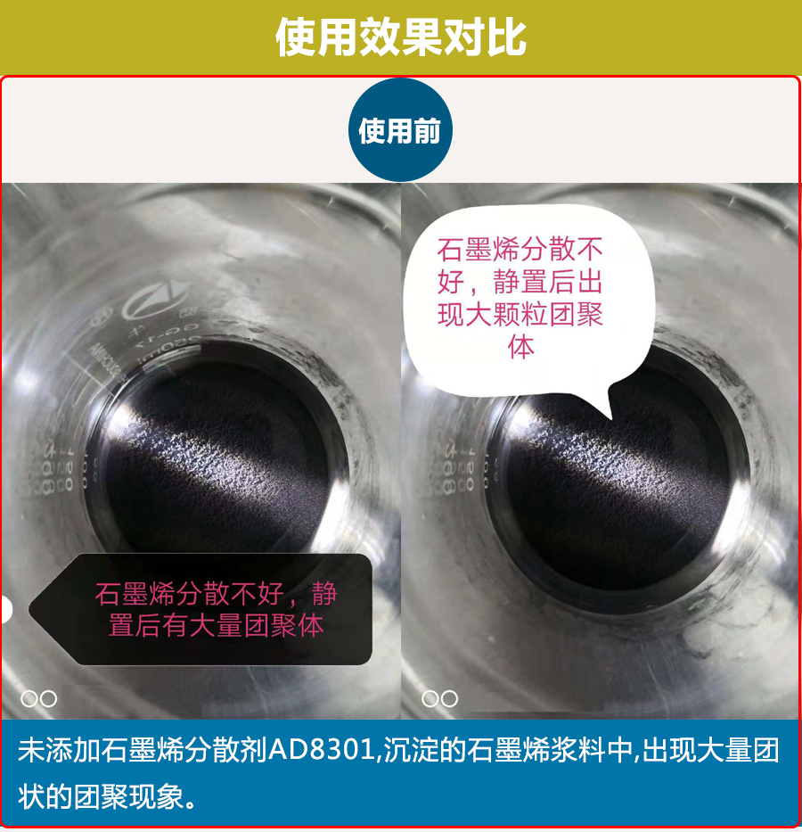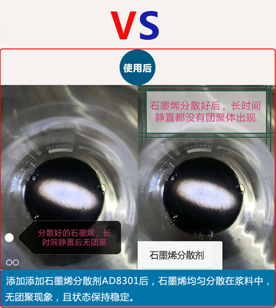 在石墨烯浆料处理分散性的问题,通过导入石墨烯分散剂,添加到浆料中,将粉体改性,表面形成一层有机包膜,包覆在粉体表面,而且石墨烯分散剂具有特殊的双亲基团,一端与粉体发生化学反应产品缔合,另一端朝外与树脂相互融合,达到分散、解聚还原到原生粒径,从而让石墨烯分散均匀分散到浆料中,而且包覆层是中性的,不受PH值的影响,而避免导致再次团聚。