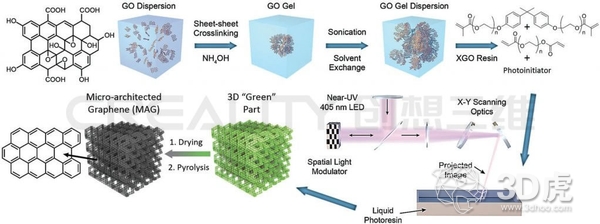 最新的发展由弗吉尼亚理工大学和劳伦斯利弗莫尔国家实验室完成,他们将石墨烯气凝胶与光敏树脂融合,应用投影微型光固化技术(PUSL)进行固化成型,并在炉子中干燥结构去除其他成分组成,能够达到低至10μm的石墨烯气凝胶3D打印机层,这是迄今为止最接近2D石墨烯碳原子的3D打印厚度。