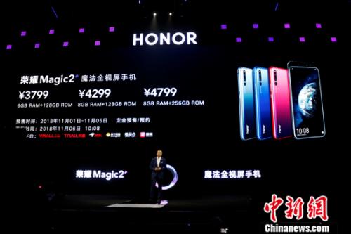 中新网客户端北京10月31日电 Magic1之后,历经684天,荣耀Magic2 今日在北京正式发布,共包含四个版本。其中6GB+128GB版本售价3799元,8GB+128GB版本售价4299元,8GB+256GB版本售价4799元,8GB+512GB 3D感光版售价5799元。