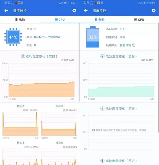 在画质为HDR高清、帧数超高条件下,经过30分钟持续游戏后,电池以及CPU的温度保持在了31℃以及44℃左右,机身表面发热也并不明显。