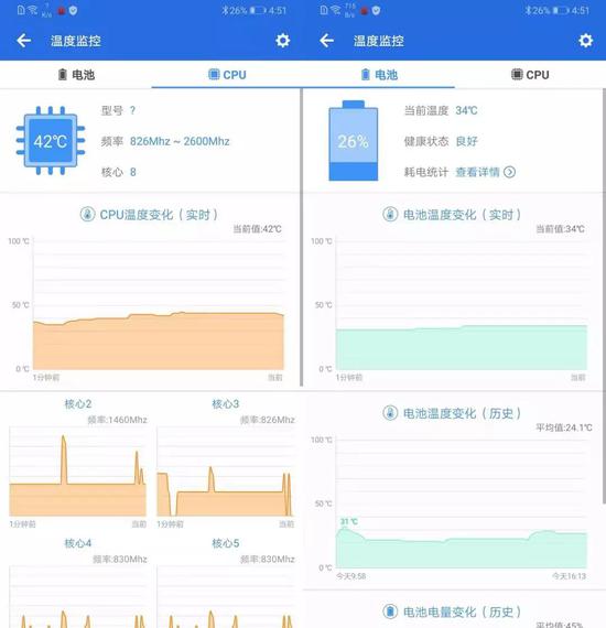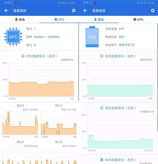 在高帧率模式下持续进行了30分钟王者荣耀游戏后,电池以及CPU的温度分别为34℃以及42℃,机身表面温度也保持的非常不错,发热并不明显。