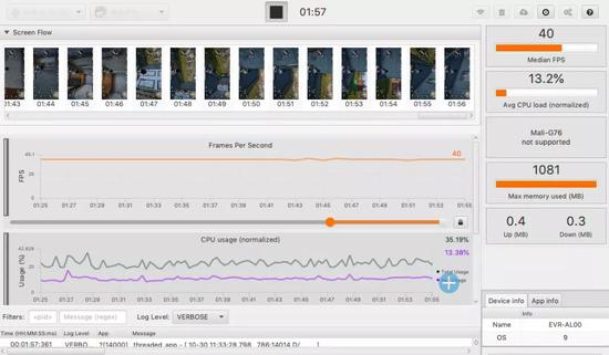 并且通过GameBench软件测试了游戏的帧数情况,即便已经经过了1小时的持续游戏,刺激战场的帧数依然非常稳定在40,几乎没有掉帧的情况。