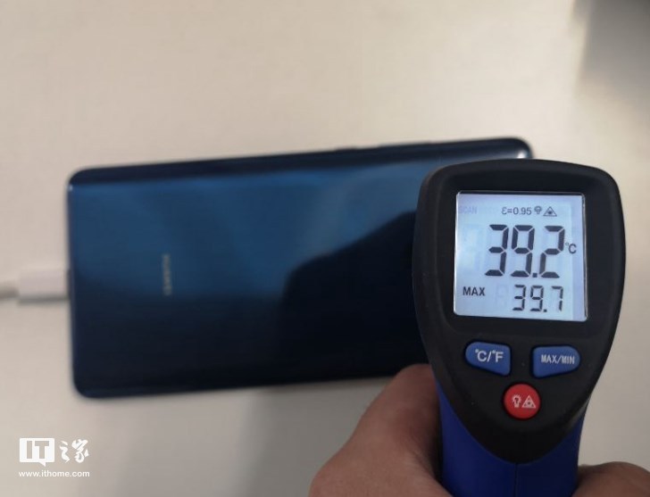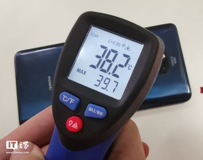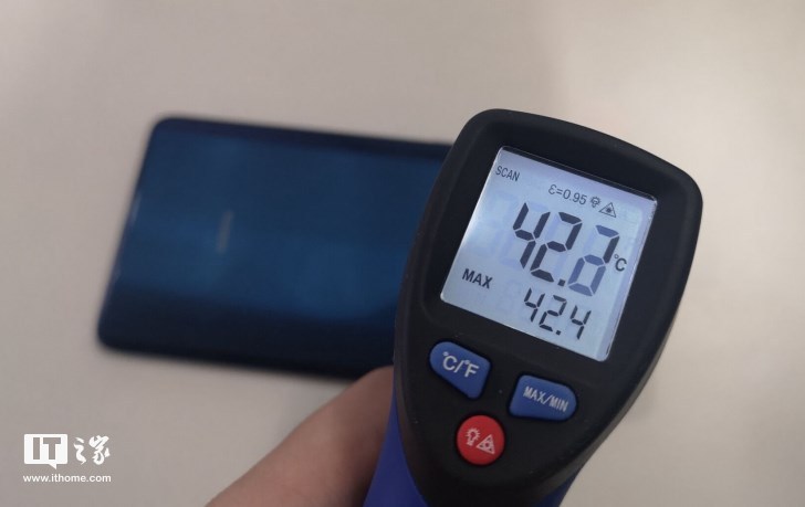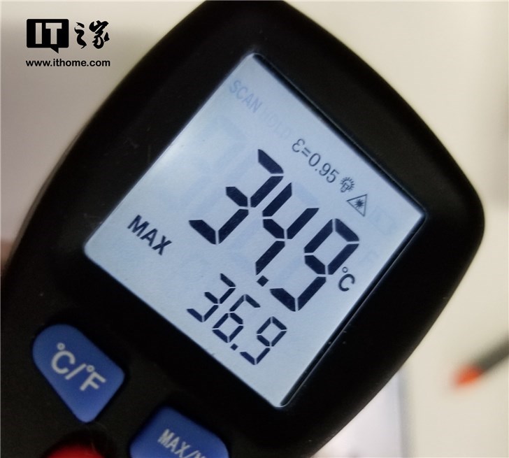 不过有趣的是,在温度计刚测机身温度的前几秒钟,温度达到了40°C左右,但随后的几秒钟,温度下降,不断移动温度计角度,最终测得最高温度为39.7°C。