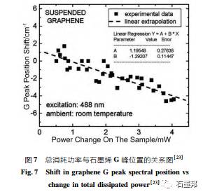 Balandin等首先采用机械剥离法制备了单层石墨烯,并将石墨烯转移到沟槽之上,在距离沟槽9~10μm处附加上大块石墨片作为散热器。实验过程中用激光照射样品的中间位置,用共聚焦拉曼光谱仪测量出G峰位置与总功率PD变化的关系(如图7所示)。