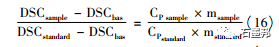 DSCsample、DSCbas、DSCstandard分别为样品、空白(做基线)样品和标准样品(蓝宝石) 的DSC曲线信号的纵坐标热焓对时间的变化率,DSCsample-DSCbas 表示样品扣除基线后的DSC曲线信号,DSCstandard-DSCbas表示标准样品扣除基线后的DSC曲线信号; Cp(sample)和Cp(standard)是样品和标准样品的比热; msample和mstandard是样品和标准样品的质量。