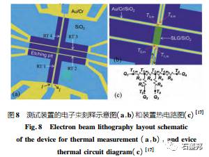 Seol等在实验过程中将剥离的单层石墨烯置于SiO2薄片上放置到Si衬底,然后采用电子束曝光和金属剥离技术,在中间制作出深度为300nm的悬浮SiO2条带,将石墨烯放置到SiO2条带上,在悬浮的石墨烯/ SiO2 条带两端各放置一条直线型和一条U型的宽1μm、长120μm的由5nm厚Cr和50nm厚Au组成的金属电阻温度计(RTJ,J = 1、2、3、4,电阻温度计是根据导体电阻随温度而变化的规律来测量温度的温度计,最常用的电阻温度计都采用金属丝绕制成感温元件)。