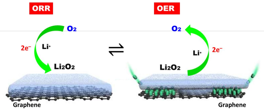 为了开发Li-O2电池有效的正极材料,Hengxing Ji和Shen Ye课题组在二甲基亚砜(DMSO)溶剂中研究了单层石墨烯的ORR和OER反应。溶剂在石墨烯电极表面上的吸附和解吸行为通过ORR和OER期间产生固有表面选择性的和频振动光谱(SFG)来评估。在LiClO4/DMSO溶液中石墨烯电极表面上初始ORR沉积Li2O2后,SFG显示,随后氧化Li2O2的OER优先在Li2O2和石墨烯之间的界面处进行,而不是在Li2O2之间的界面处进行。因此,OER倾向于通过在大部分沉积Li2O2被氧化之前减小它们的接触面积来降低Li2O2和石墨烯之间的电导率,这是OER高过电位的原因。