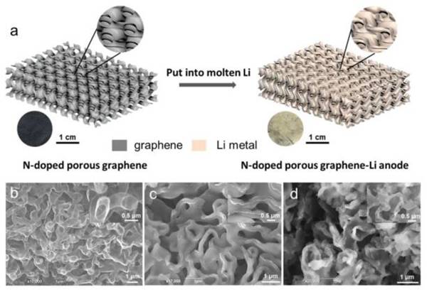 (a)纳米多孔氮掺杂石墨烯-Li负极的制备示意图(实物图:氮掺杂的石墨烯和氮掺杂的石墨烯-Li负极;