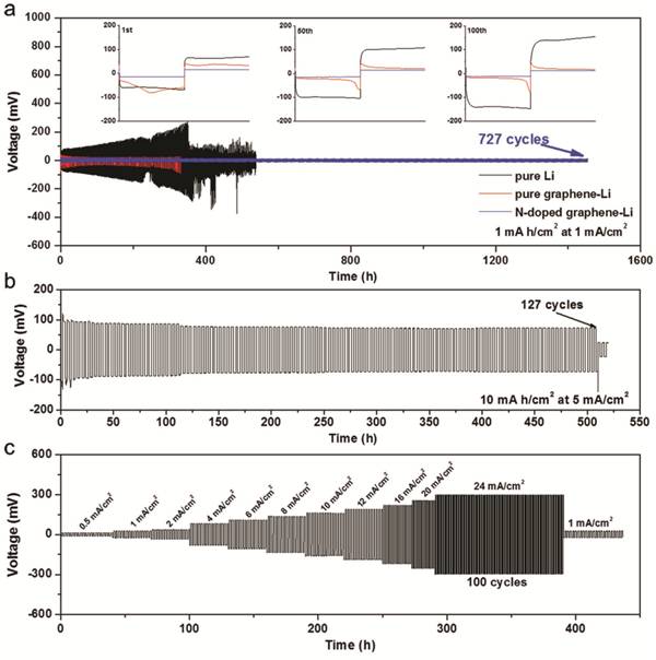 (a)在1 mA cm-2的电流密度下,1mAh cm-2的剥离/电镀容量时,纯Li箔、纯石墨烯-Li和氮掺杂石墨烯-Li对称电池的恒电流循环图(插图:对应的电压曲线);