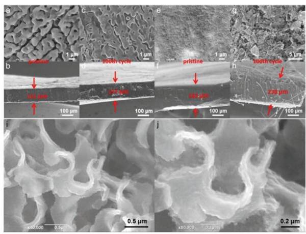 (i-j)在1 mA cm-2的电流密度下,以1 mAh cm-2的剥离/电镀容量循环50次后,纳米多孔氮掺杂石墨烯-Li负极截面的放大图。