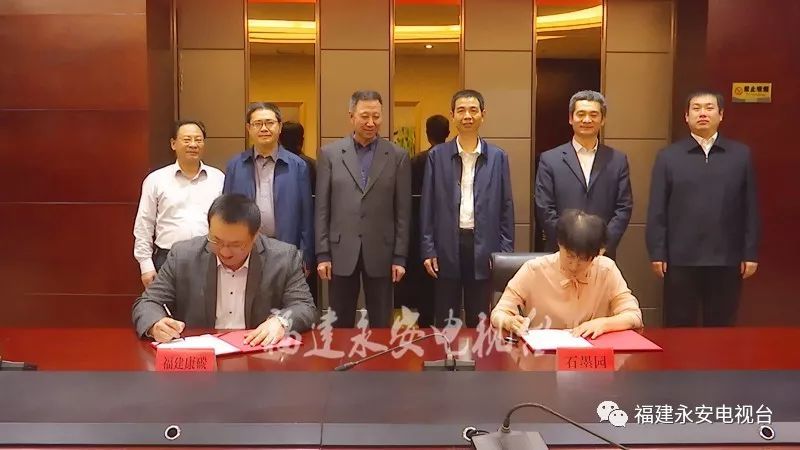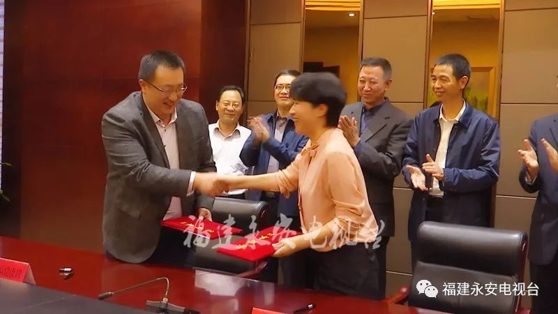 ▲永安市委副书记廖艳希代表永安市石墨和石墨烯产业园与福建康碳复合材料科技有限公司董事长夏汇浩签约