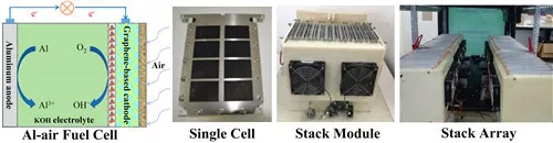 ▲图1 石墨烯基铝燃料电池结构示意图和核心部件