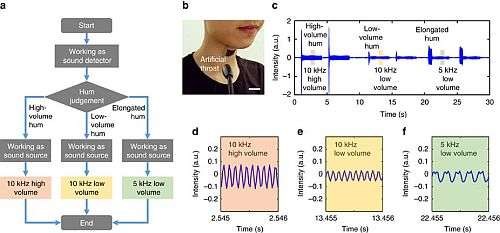 作为人体器官替代品:清华大学的一个团队开发出了一种基于激光诱导石墨烯(LIG)的智能人造喉咙。这种智能装置可以以单个单元来检测和产生声音。生物相容性人造咽喉附着在喉部,旨在产生可识别和可控制的声音,而集成式声学装置可以根据石墨烯的热声效应产生声音,并根据其压阻效应检测声音。(参见《An intelligent artificial throat with sound-sensing ability based on laser induced graphene(基于激光诱导石墨烯的智能人造喉咙具有声音感知能力)”。)