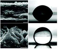 图2:在直接脉冲激光写入流程之前(上面的一对)和之后(下面的一对)的(左边)石墨烯表面图案和(右边)润湿性接触角对比。(图片来源:爱荷华州立大学)