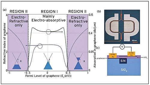 图3:石墨烯的电光特性。(a)随本征石墨烯费米能级变化的理论吸收率和折射率(区域I高吸收、区域II低吸收)。(b)构造器件的光学显微照片(干涉仪臂伪色)。(c)器件横截面,显示在Si3N4波导上有石墨烯-HfO2-石墨烯电容器。 (图片来源:哥伦比亚大学)