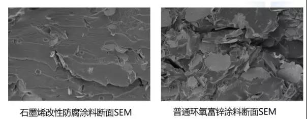 图5 石墨烯改性防腐涂料与普通环氧富锌涂料断面SEM对比[5]