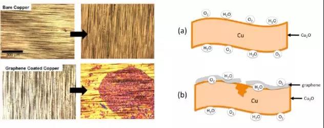 图7 石墨烯涂层和裸铜腐蚀对比及铜表面腐蚀示意图[7]