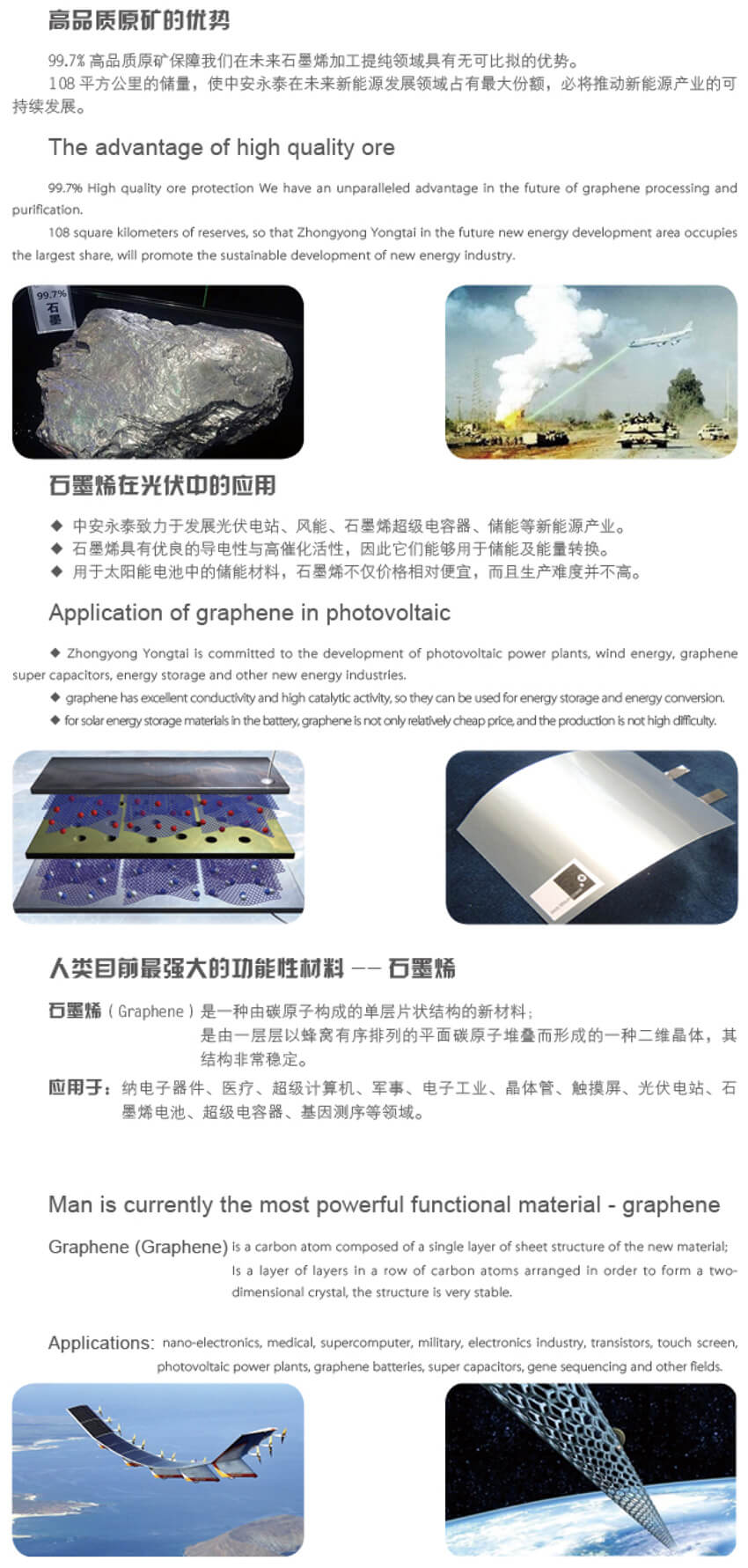 中安永泰石墨烯应用 石墨烯网 • 2018年11月24日 12:30 • 产业新闻 • 阅读 4411 中安永泰利用99.7%的高纯石墨原矿资源,依托中科院、社科院等院士组成的院士工作站作为技术保障。致力于军事、航天、医疗、风能、光伏发电、石墨、石墨烯 、石墨烯基、先进光电与能源材料、储能科技等新能源产业相关技术研发、应用、投资。打造中国新能源的上中下游完整产业链。努力实现全新材料、全新应用、全新发展、全新未来的新能源发展新模式。 本文来自中安永泰,本文观点不代表石墨烯网立场,转载请联系原作者。 中安永泰 赞 (0) 石墨烯网 0 生成海报 甘肃省副省长李沛兴一行来广西大学考察 上一篇 2018年11月24日 12:27 揭秘华为Mate 20 X 石墨烯膜散热如何从0到1 下一篇 2018年11月24日 12:46 发表回复 请登录后评论...登录后才能评论 提交