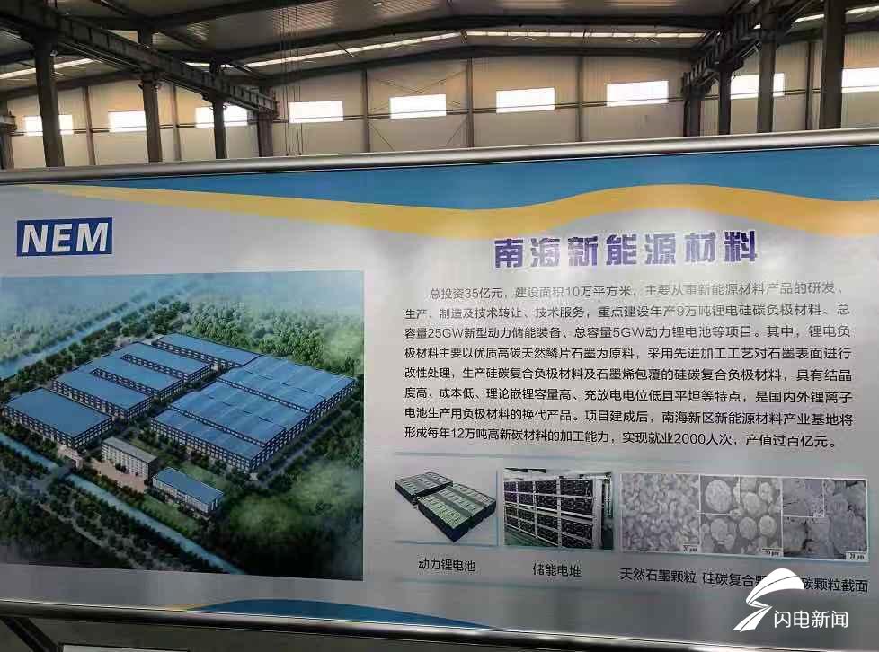 南海新能源材料项目总投资35亿元,建筑面积10万平方米,主要建设年产9万吨锂电硅碳负极材料、总容量25GW新型动力储能装备、总容量5GW动力锂电池等项目。其中,锂电硅碳负极材料主要以优质高碳天然鳞片石墨为原料,采用先进加工工艺对石墨表面进行改性处理,生产硅碳复合负极材料及石墨烯包覆的硅碳复合负极材料,具有结晶度高、成本低、理论嵌锂容量高、充放电电位低且平坦等特点,是国内外锂离子电池生产用负极材料的换代产品。目前,厂房已建设完成,正在进行设备安装调试,预计年底前部分投产。