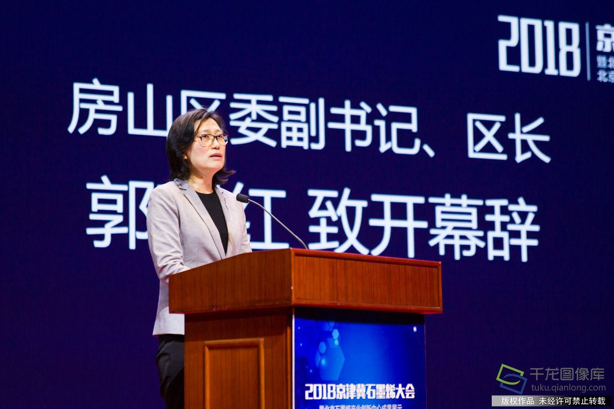 11月27日,2018京津冀石墨烯大会暨北京石墨烯产业创新中心成果展示、北京房山新材料产业创新发展推介在房山区举办。图为房山区委副书记、区长郭延红致开幕词( 图片来源:tuku.qianlong.com)。千龙网记者 于颖摄