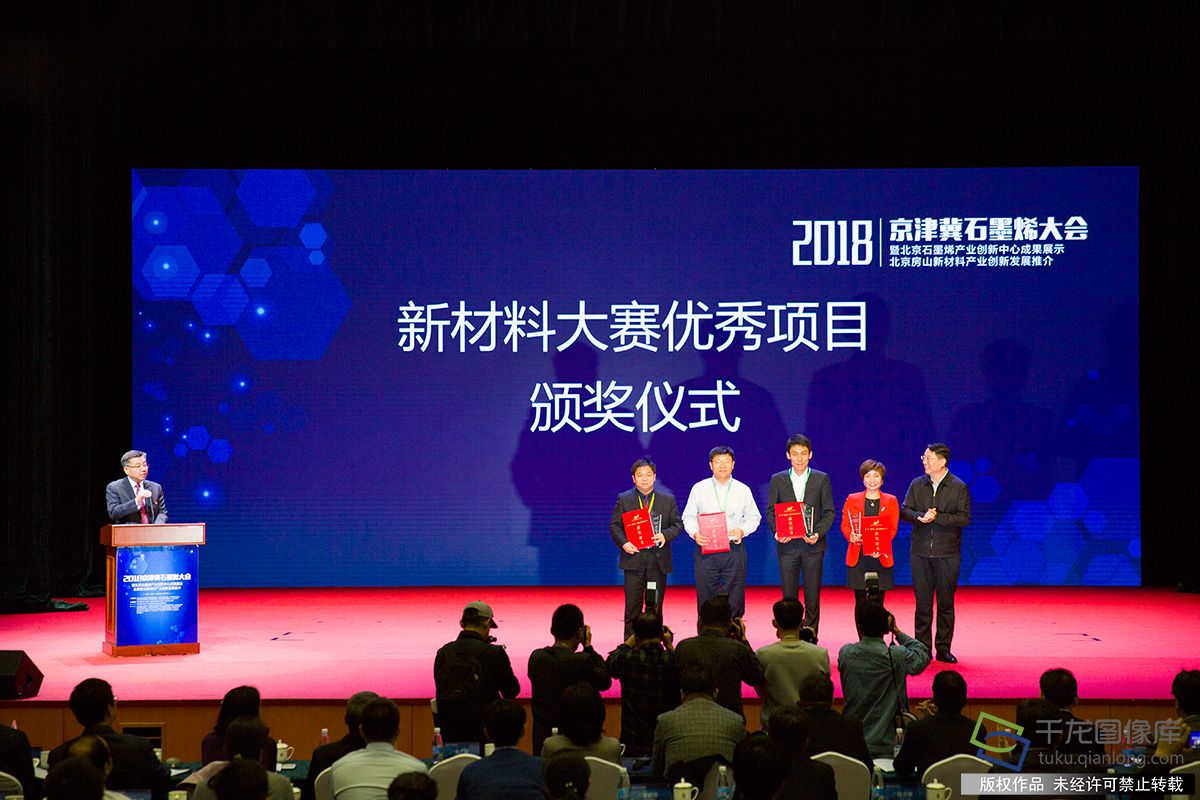 11月27日,2018京津冀石墨烯大会暨北京石墨烯产业创新中心成果展示、北京房山新材料产业创新发展推介在房山区举办。图为2018年获得燕山新材料大赛优秀项目的企业上台领奖( 图片来源:tuku.qianlong.com)。千龙网记者 于颖摄