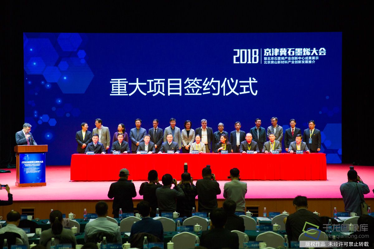 11月27日,2018京津冀石墨烯大会暨北京石墨烯产业创新中心成果展示、北京房山新材料产业创新发展推介在房山区举办。图为中国航发北京航空材料研究院、北京石化新材料科技产业基地、北京石墨烯技术研究院等单位在台上签署合作协议( 图片来源:tuku.qianlong.com)。千龙网记者 于颖摄