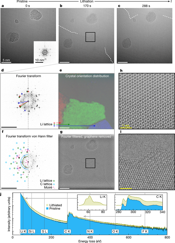 近日,德国乌尔姆大学Ute Kaiser与马克思.普朗克研究所Matthias Kühne(共同通讯作者)在Nature上发表题为“Reversible superdense ordering of lithium between two graphene sheets”的文章。研究人员利用原位低压透射电子显微镜研究锂插入双层石墨烯,并使用球面和色差校正来增强对比度和分辨率到所需水平。锂原子在两个碳片之间呈现多层密堆积顺序,与该超密相相关的锂储存容量远远超过LiC6形成的预测值。因此,二维层状材料中可能存在不同的离子存储排列。