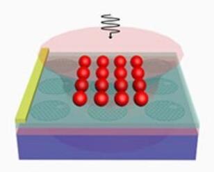 一款由纳米级石墨烯圆盘阵列构成的新型传感器,每个圆盘有一个偏心孔,能够同时检测两种物质(红球)。这些圆盘位于离子凝胶(图中绿色部分)和氟化钙(图中深粉色部分)之间,用于向传感器施加电压并帮助产生SPP。